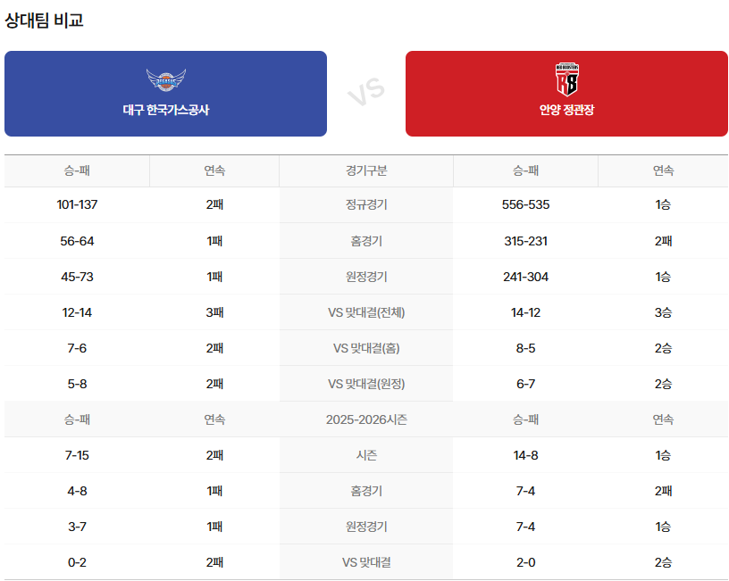 안양 정관장은 12/17 울산 원정 이후 하루 쉰 뒤 대구 원정으로, 역시 이동은 있지만 비슷한 휴식일을 확보한 상황이다.