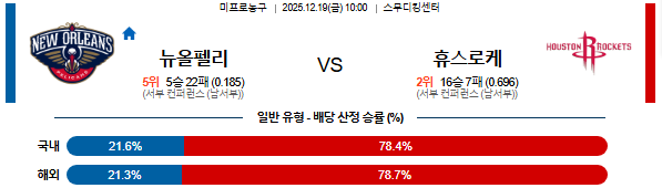 대진: 뉴올리언스 펠리컨스(홈, 5승 22패) vs 휴스턴 로키츠(원정, 16승 7패)