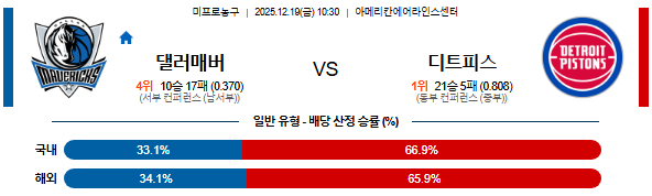 대진: 댈러스 매버릭스(홈, 10승 17패) vs 디트로이트 피스톤스(원정, 21승 5패)