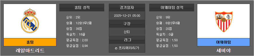 2025년 12월 21일 라리가 레알마드리드 vs 세비야 스포츠중계:스포츠무료중계추천