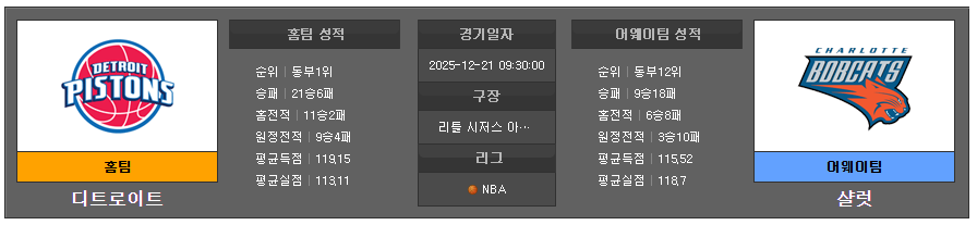 2025년 12월 21일 NBA 디트로이트 vs 샬럿 스포츠중계:스포츠무료중계추천디트로이트 vs 샬럿은 전력·폼·라인 구조를 봤을 때 디트로이트 승리 쪽이 기본 방향이고,