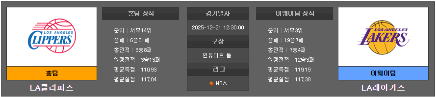 2025년 12월 21일 NBA LA클리퍼스 vs LA레이커스 스포츠중계:스포츠무료중계추천## 1. 매치업 기본 프레임