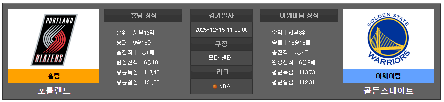 2025년 12월 15일 NBA 포틀랜드 vs 골든스테이트 스포츠중계:스포츠무료중계추천1. 경기 개요