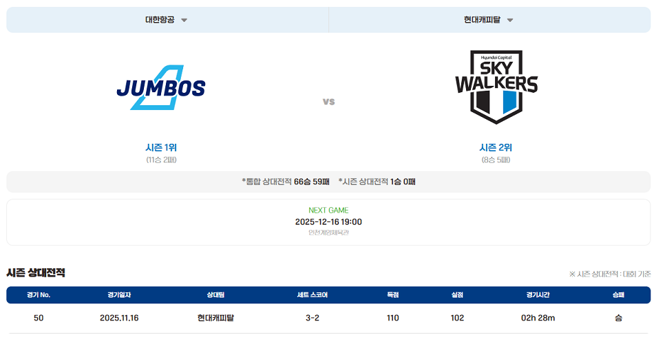대진: 대한항공 점보스(홈, 11승 2패) vs 현대캐피탈 스카이워커스(원정, 8승 5패).​