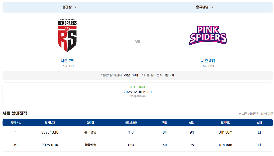2025년 12월 16일 V리그여자부 대전정관장 vs 인천흥국생명 스포츠중계:스포츠무료중계추천1. 경기 개요