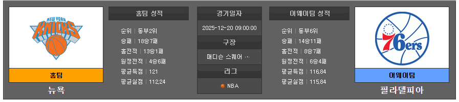 2025년 12월 20일 NBA 뉴욕 vs 필라델피아 스포츠중계:스포츠무료중계추천