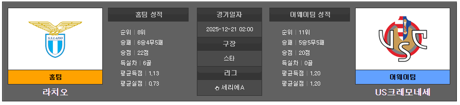 2025년 12월 21일 세리에A 라치오 vs 크레모네세 스포츠중계:스포츠무료중계추천라치오는 실제로 4-3-3 점유형 구조와 최근 상승세를 바탕으로,