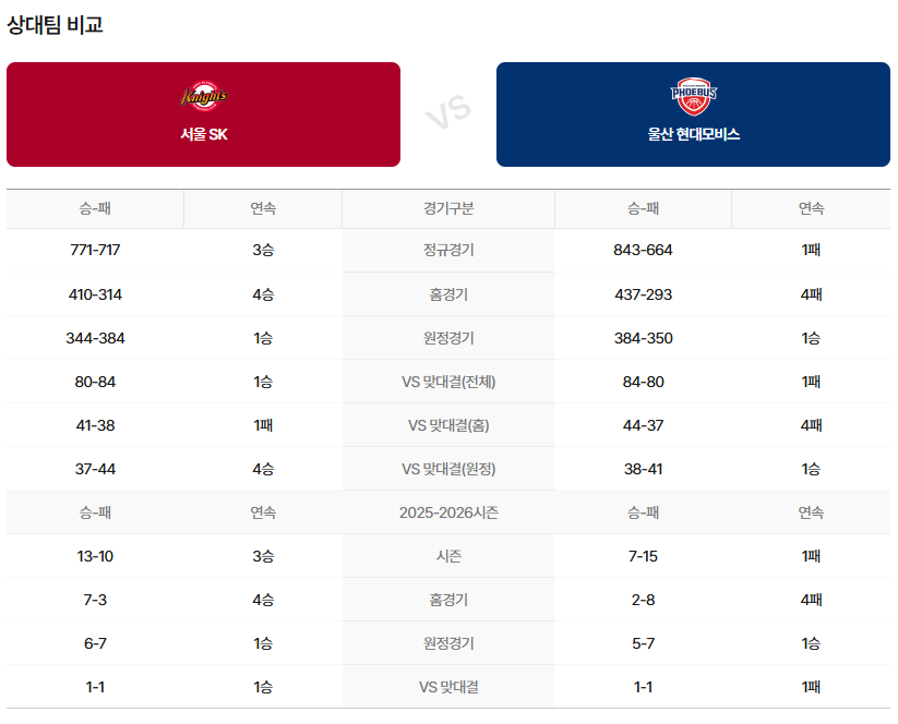 가장 최근 맞대결에서는 SK가 울산 원정에서 89–68로 크게 이긴 경기 기록이 있다.
